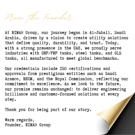 Rimah Group is a leading manufacturer and supplier of fiberglass-based and steel utility solutions, firmly established in the UAE, with its headquarters in Al-Jubail, Saudi Arabia. Over the years, we have built a strong reputation for delivering high-performance products such as GRP/FRP tanks, steel tanks, GLS tanks, and more—each designed and manufactured to meet international quality standards. Our excellence is backed by ISO certifications and multiple vendor approvals from leading organizations, including Saudi Aramco, NEOM, the Ministry of Housing, and the Royal Commission.